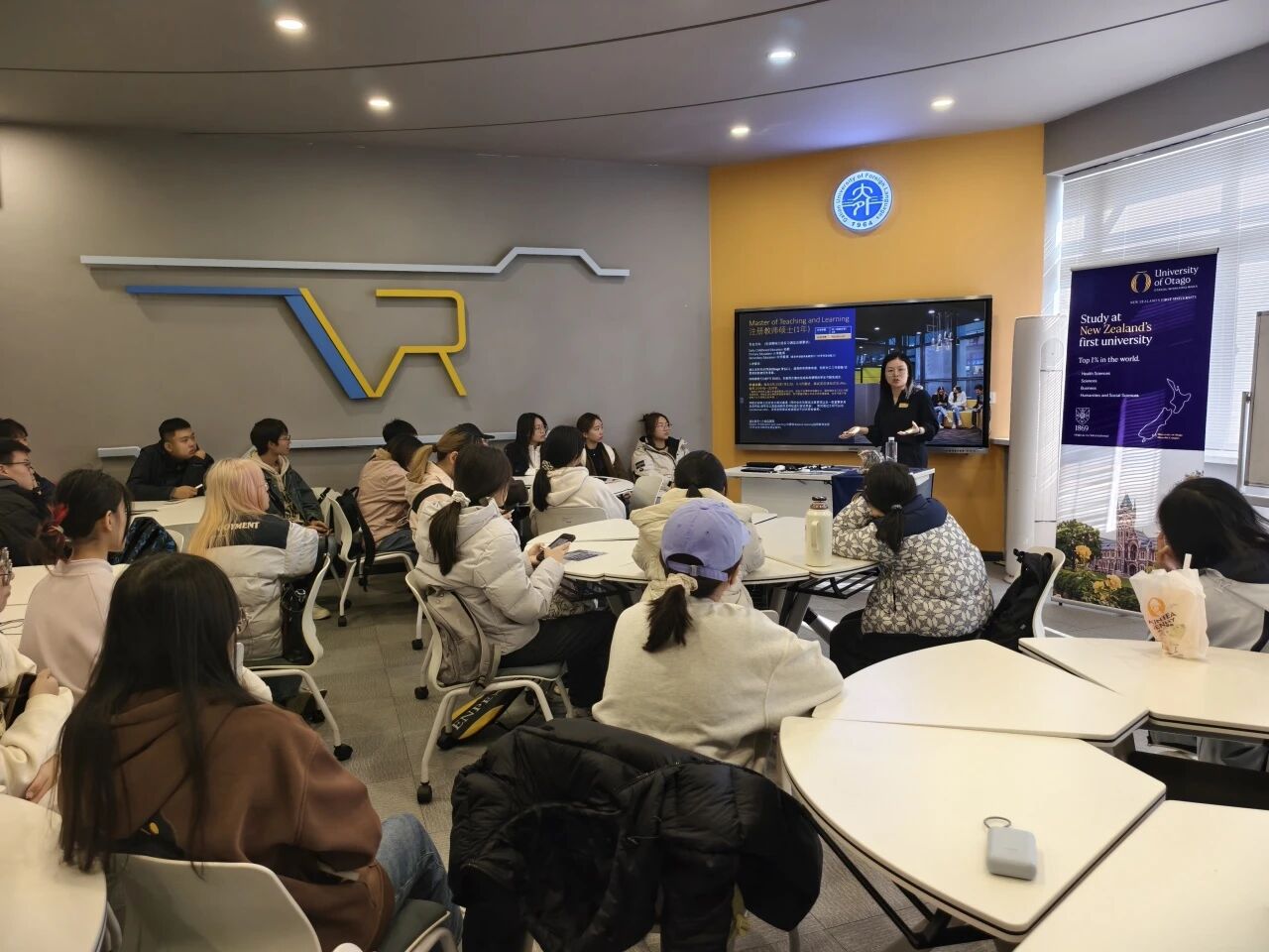 为积极落实学校“国际教育交流月”工作部署,拓宽学生国际视野、助力学生学业规划,英语学院于10月21日邀请新西兰奥塔哥大学国际部大中华区市场经理张悦女士在11教VR实训中心进行了留学项目宣讲会。宣讲会由学院国际交流外事秘书黄新智老师主持,对留学项目感兴趣的本科生和研究生参加了此次宣讲会。
