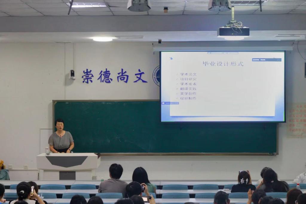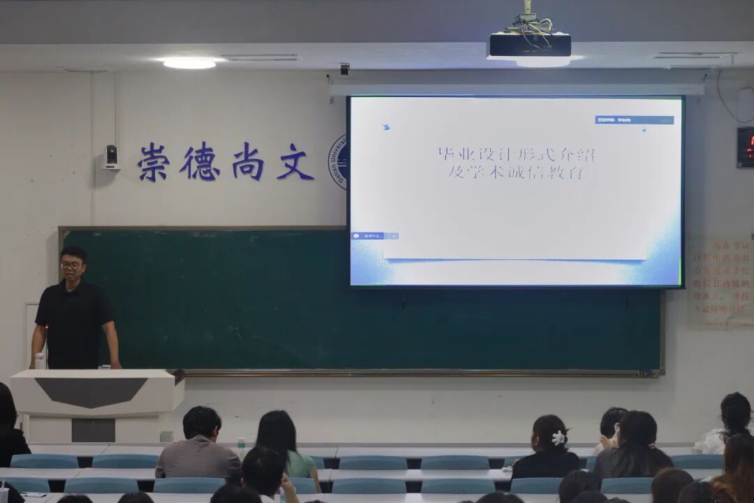 为切实提高本科毕业设计质量,规范毕业设计管理,加强学术诚信建设,英语学院于9月10日于明德楼101室举行了2026届本科毕业生毕业设计开题动员会及学术诚信教育。会议由英语学院2022级辅导员李延奇主持,英语学院副院长罗俏鹃、教研室主任刘清主讲,2022级全体本科生参与此次动员会。