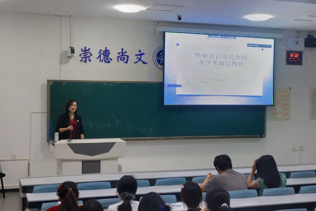 随后,刘清老师为同学们详细讲解了毕业设计的具体要求,内容包括毕业设计形式与方案、日程安排及各阶段时间节点。刘清老师强调了科学合理地选择研究方向的重要性,并敦促同学们与论文导师建立并保持积极主动的有效沟通,以期扎实、高效地推进毕业论文的各项工作。