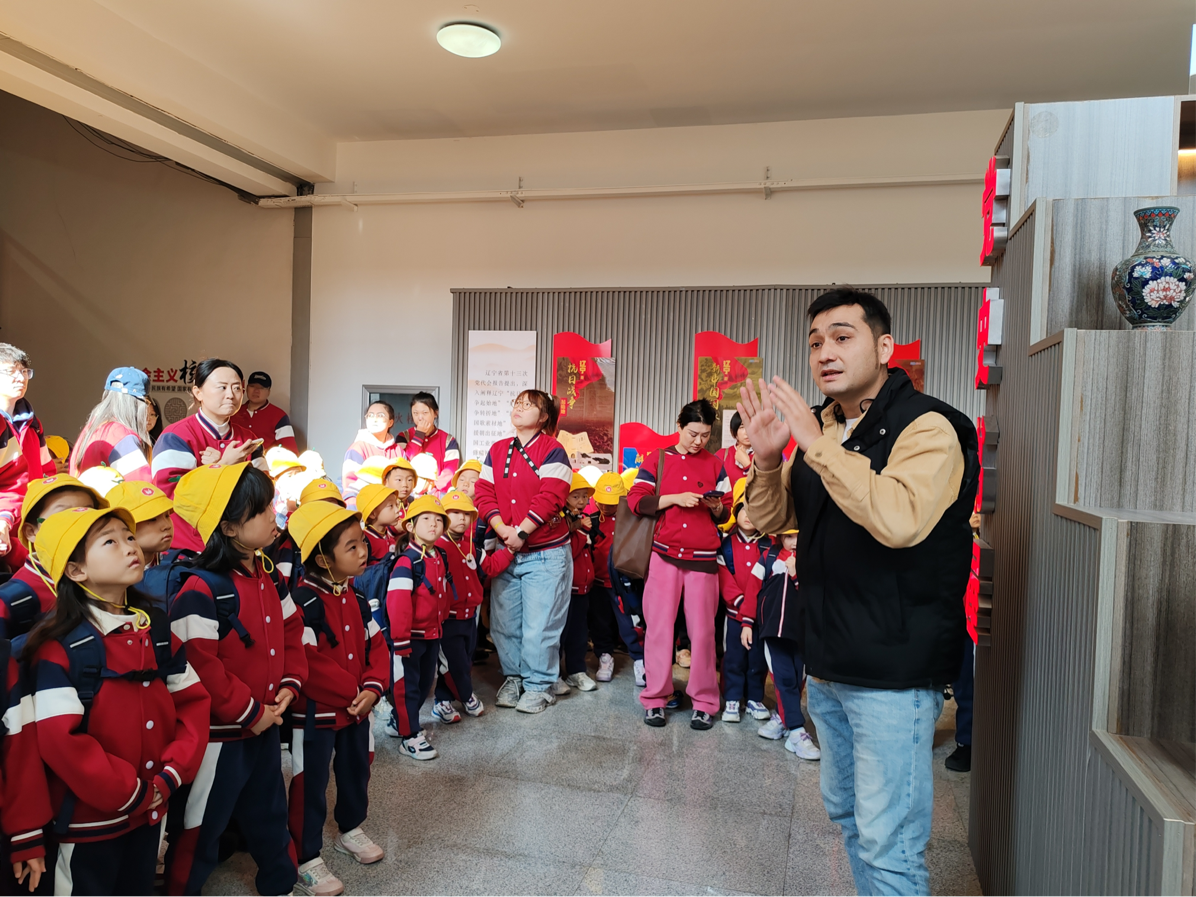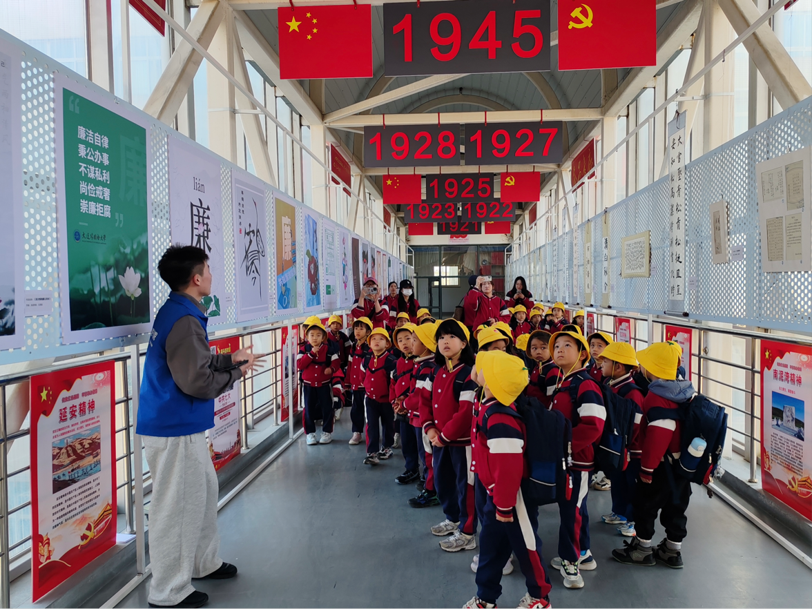 在英语学院同学们的耐心陪同与细心讲解下,童正学府师生依次参观了党史长廊、党史书屋、VR实训室及丹若工作室。志愿者们还精心设计了互动环节,现场教授小朋友们简单的英语单词,在轻松氛围中激发他们学习外语的兴趣。此次参观不仅帮助小朋友们了解中国共产党的光辉历史,也让他们领悟了现代语言教学技术与民族团结的重要意义。