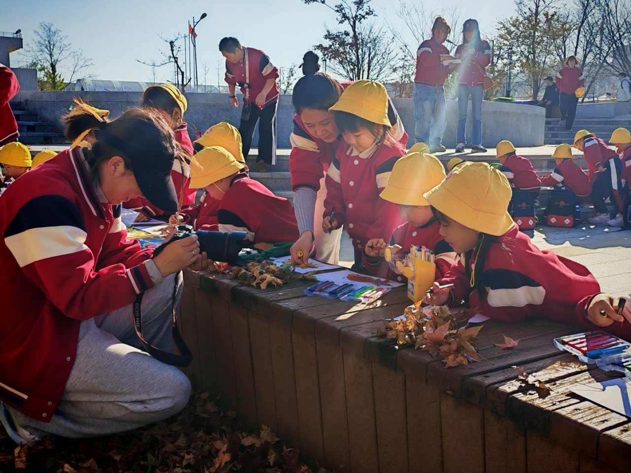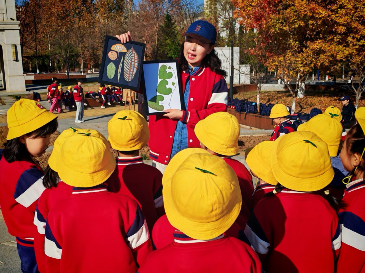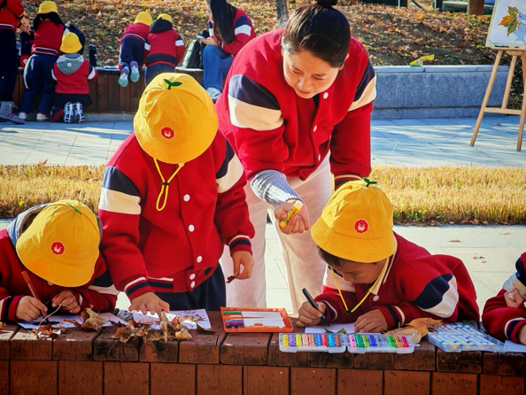活动最后,童正学府的师生们齐聚大外钟楼前,开展“画秋天”主题活动。博物刘博士现场讲解叶脉的多种形态及秋天叶子变黄的科学原理,美术鲁老师则带领孩子们就地取材,利用银杏叶等自然素材创作作品,引导他们在实践中感受自然与艺术的融合。