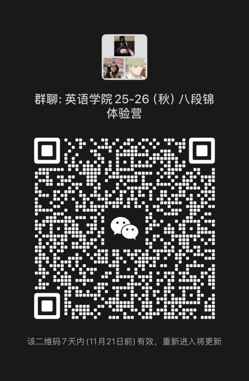 八段锦作为中国传统养生功法,动作柔和连贯,适合各年龄阶段练习,长期坚持有助于调理气血、增强体质、缓解疲劳。请有意参与的师生即日起通过扫描群聊二维码进行报名参与,具体教学内容将在群聊中进行通知。