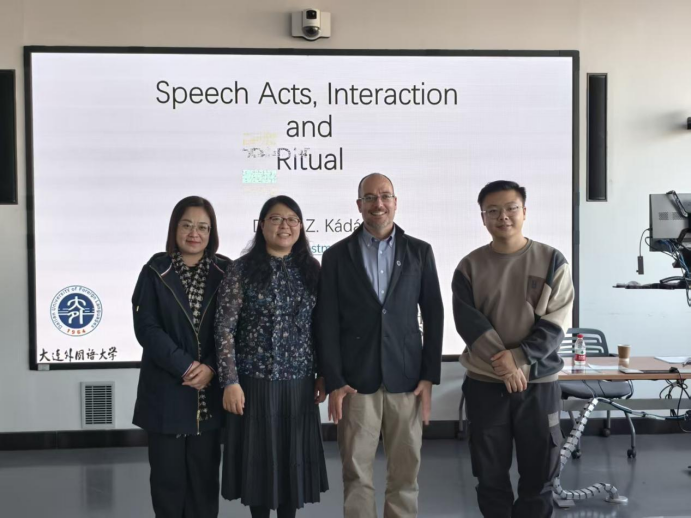 11月14日,大连外国语大学启航外籍专家、“111”引智基地国际带头人、博士生导师丹尼尔·康达教授(Dániel Kádár)应科研处和英语学院邀请,为我院师生做了题为“互动仪式与(不)礼貌前沿研究”的学术讲座。讲座由语用学团队韩丹老师主持,部分专任教师、本科生及研究生参加了此次讲座。