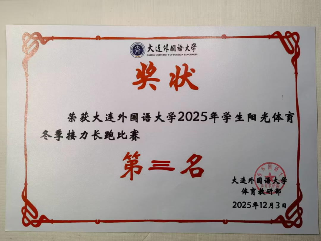 12月3日下午,大连外国语大学2025年学生阳光体育冬季接力长跑比赛正式拉开帷幕。英语学院2024级参赛队伍凭借出色的团队协作与顽强拼搏的精神,在激烈角逐中脱颖而出,荣获第三名的优异成绩。队员们依次接力,用坚实的步伐生动诠释了“无体育,不英院”的活力与激情。