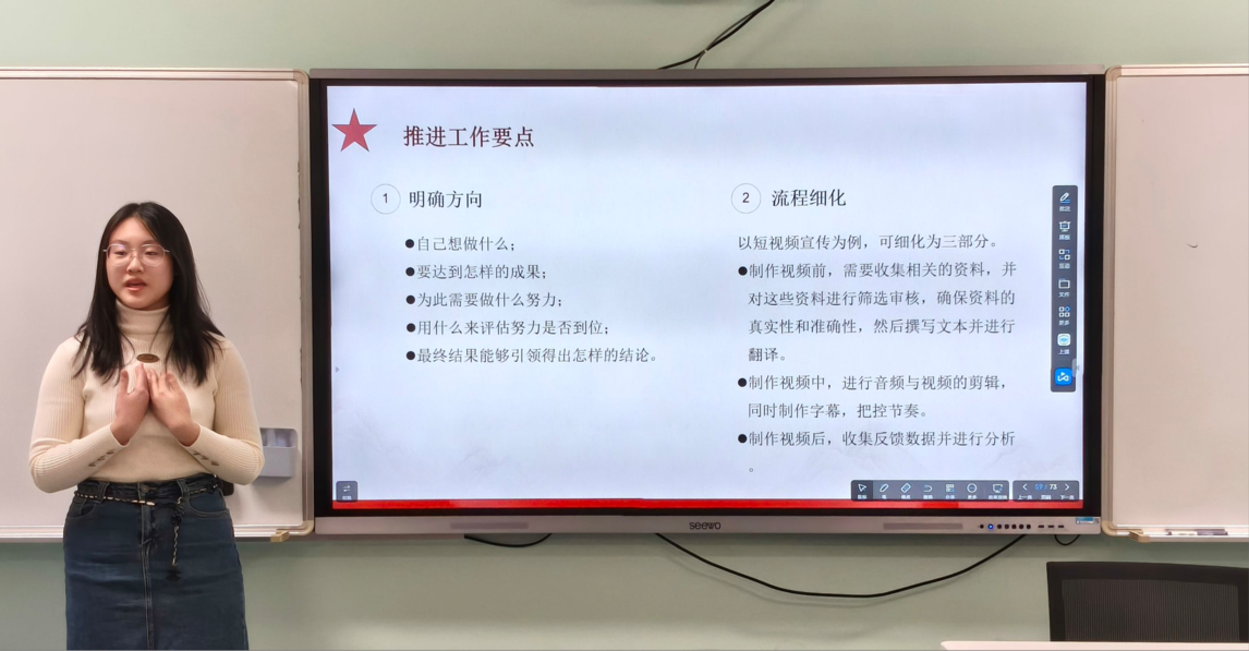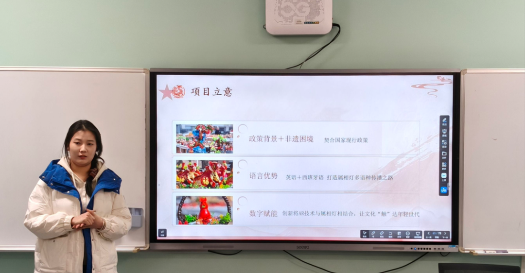随后,李延奇老师从“什么是大创项目”切入,系统介绍了项目体系、项目类型,并对同学们最关心的申报政策进行了逐一梳理和重点说明。接下来,王孟同学和武涵冰同学分享了其团队组建、导师选择、课题凝练和项目执行中的挑战与收获,为在场同学提供了极具参考价值的实战指南。 最后,英语学院创新创业项目学生负责人何予同学介绍了本年度“大创计划”的申报具体流程、时间节点和结题要求,以及撰写项目申报书的要点与技巧。
