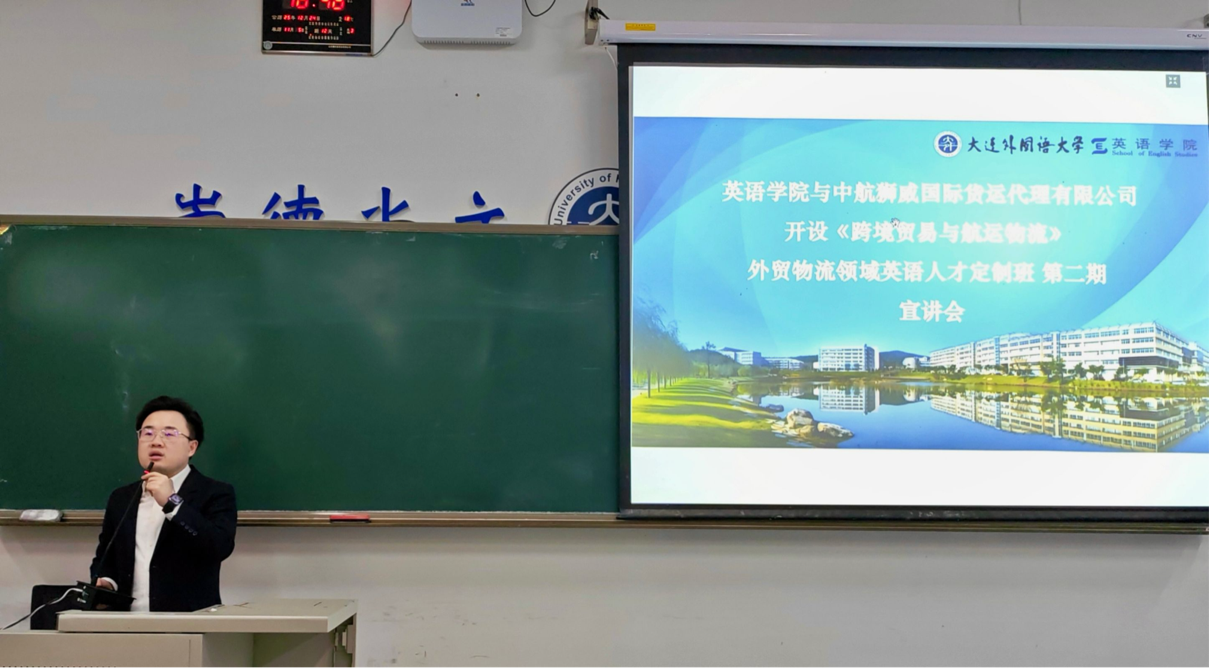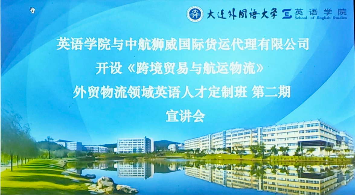 为进一步深化校企合作,推动产学研融合,培养适应跨境贸易与航运物流领域发展需求的高素质英语专业人才,12月24日下午,英语学院与中航狮威国际货运代理有限公司联合开展了“跨境贸易与航运物流”外贸物流领域英语人才定制班(第二期)宣讲会。本次宣讲会邀请到中航狮威国际货运代理有限公司大连分公司总经理张承权、英语学院团委书记曲镜达,以及已入职该公司的2021届毕业生李昕航、正在参与定制班实习的2022级学生马慧彤共同出席。