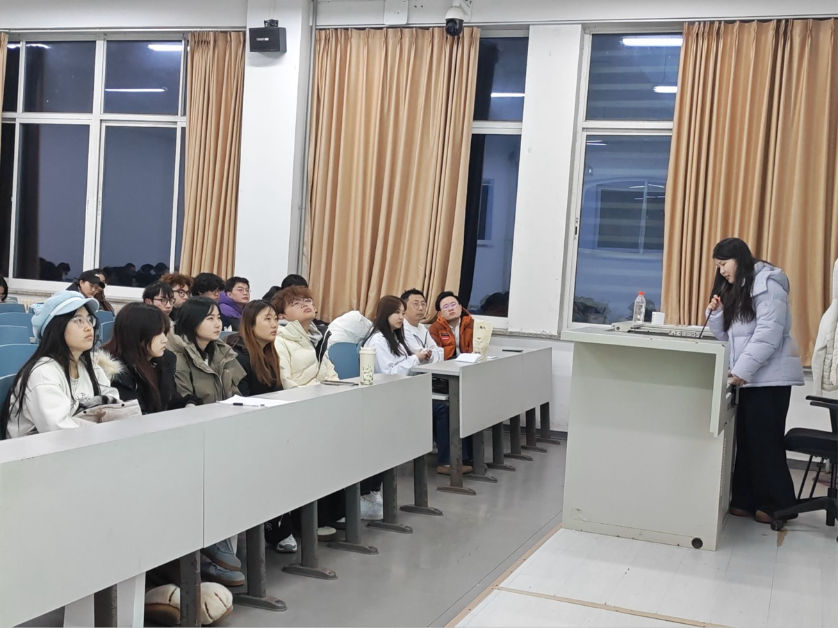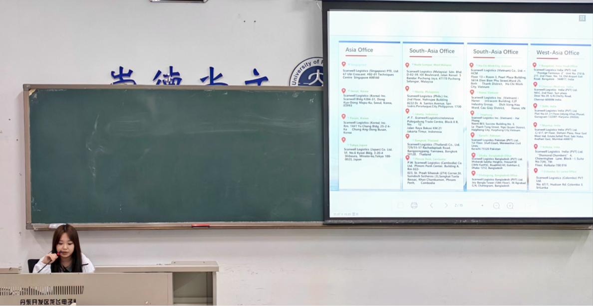 宣讲会上,张承权总经理详细介绍了中航狮威45年的行业发展历程、全球70余家分公司的布局,以及公司对英语专业人才的重视与培养体系。他强调,英语专业学生不仅需要具备专八等语言能力,更应拓展对国际贸易、物流运作及跨文化沟通的综合理解。随后,李昕航学姐结合自身从实习到正式入职一年半的成长经历,分享了在实际工作中专业能力的提升与心性的磨炼过程;马慧彤学姐则系统介绍了定制班的课程设置、学分转换机制及实习安排。最后,曲镜达老师进一步说明,本次定制班面向2023级开设,为专业选修课;学生完成课程后,有望进入企业实习,实习期满后还有机会直接签约入职。
