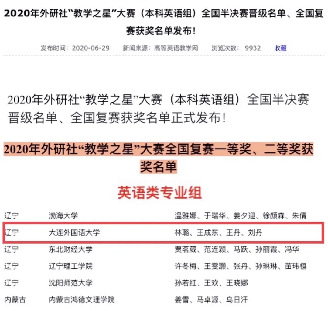 6月29日,2020年外研社“教学之星”大赛(本科英语组)全国复赛获奖名单正式发布!由林璐、王成东、王丹、刘丹四位老师组成的英语学院教师团队喜获全国复赛英语类专业组一等奖,四位教师将获得全国复赛获奖证书及U讲堂教师发展智慧研修卡。