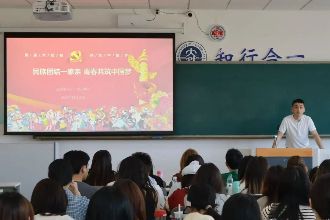 在第六讲的课堂上,英语学院2021级辅导员达尼亚尔江·亚力坤江带来了《民族团结一家亲,青春共筑中国梦》专题课程。达尼老师从“什么是民族团结”“为什么要维护民族团结”“如何维护民族团结”三个维度展开,深入解读我国民族政策并阐释民族团结的内涵。他表示,民族团结是各民族人民的生命线,同时对维护国家稳定、促进社会发展具有重要意义。最后,达尼老师通过我校实践活动案例展现了民族团结的蓬勃生机,并鼓励大家自觉将认识转化为行动,踊跃投身实践,争做民族团结进步的坚定维护者。