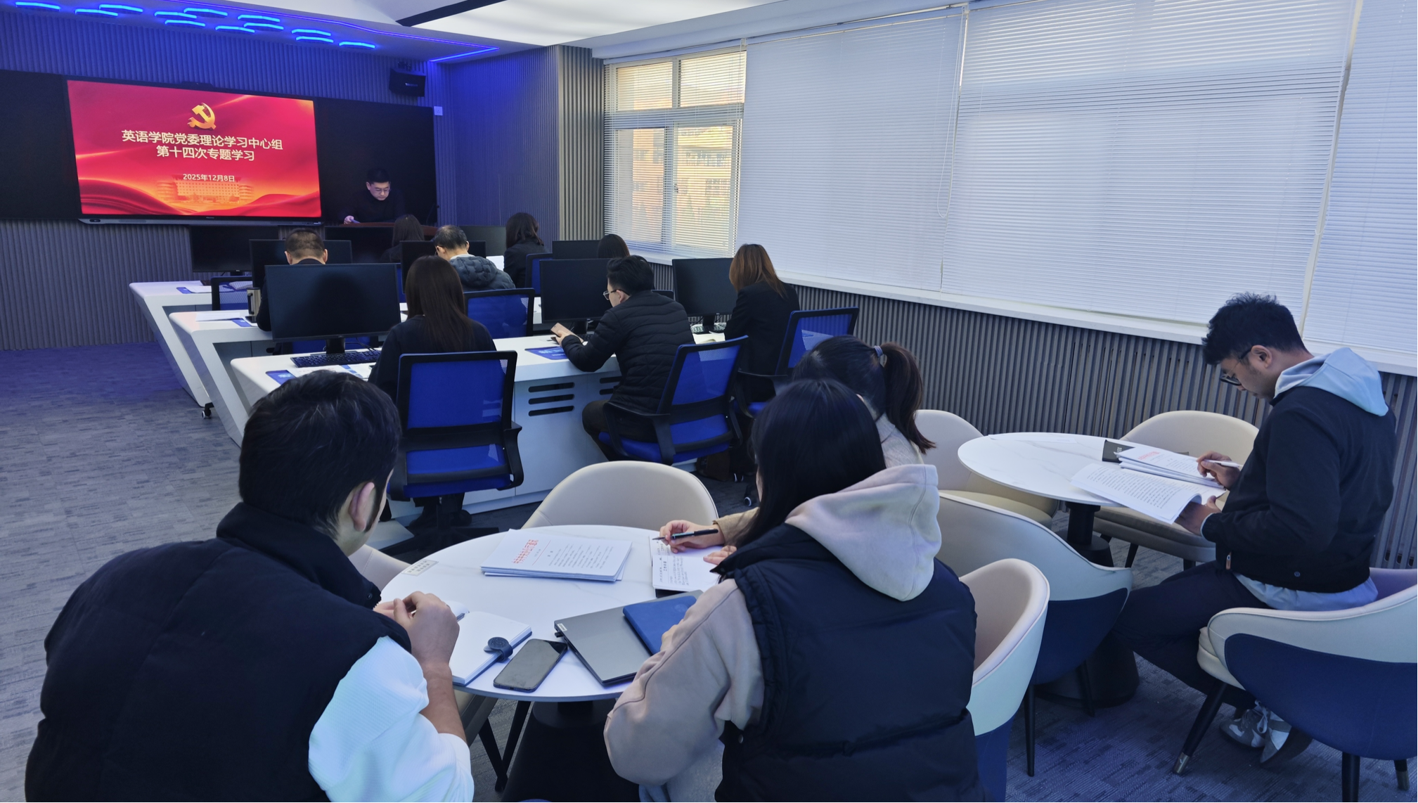 12月8日上午,英语学院党委理论学习中心组开展落实“第一议题”制度专题学习。党委理论学习中心组成员、党委委员、组织员、各党支部书记和辅导员参加会议。学院党委书记梁若冰主持会议。