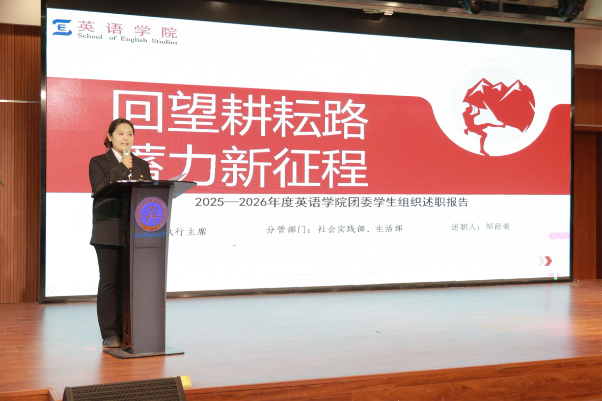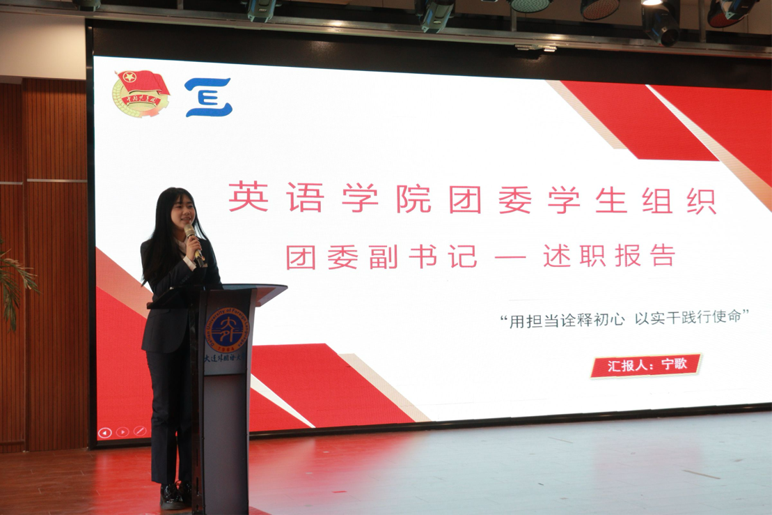 英语学院团委副书记宁歌聚焦团委整体工作开展述职,从工作回顾、未来展望等方面进行汇报,为英院团委思想引领、组织建设等核心工作的推进锚定了方向,让团委后续工作的开展更上一层楼。