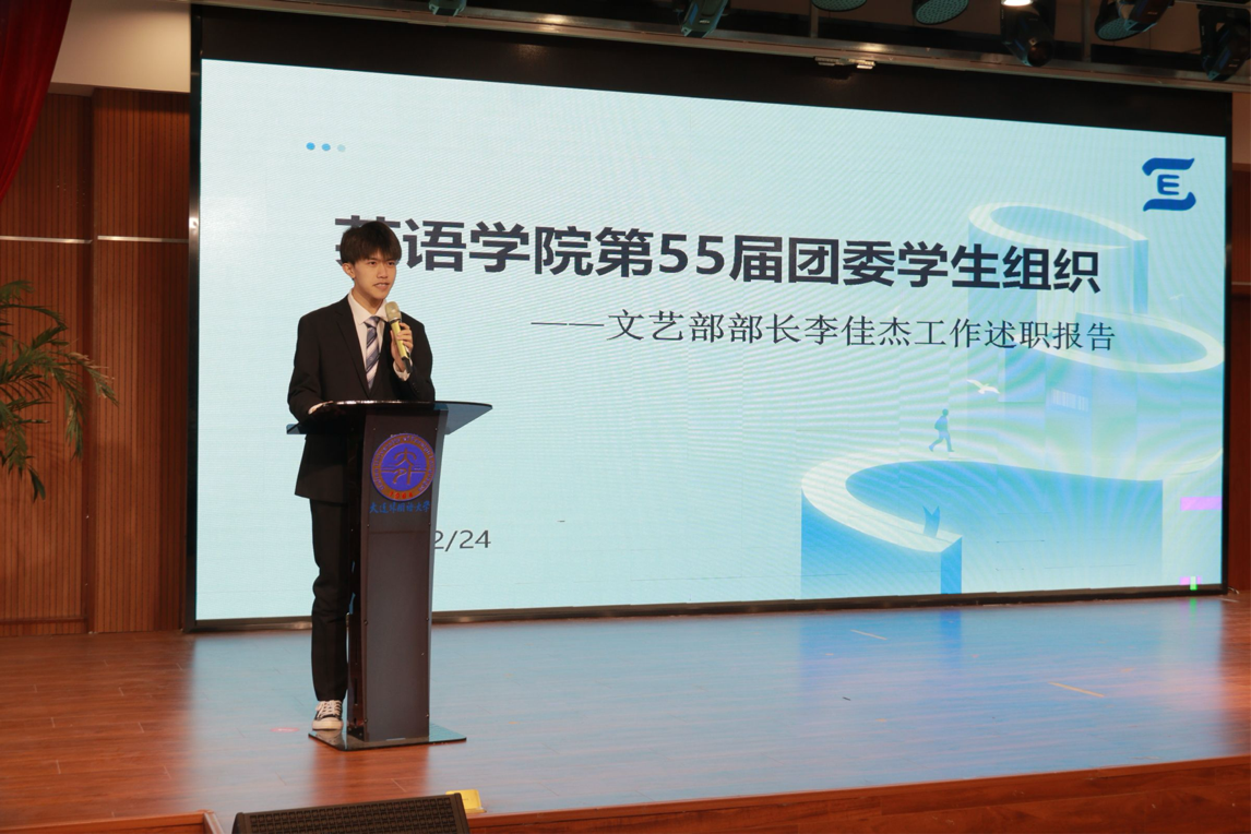 文艺部部长李佳杰以文艺嘉年华为核心展开述职,详细复盘了活动的策划、执行与效果反馈,分享了文艺活动在丰富校园文化生活中的作用,也提出了活动形式创新的思考。